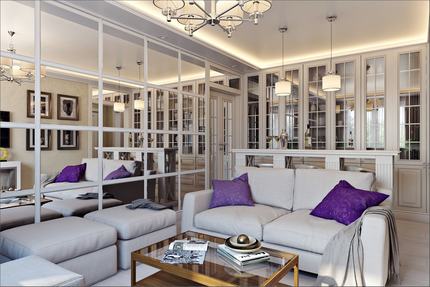 В гостиной зеркала можно использовать для создания акцентных стен. Например, можно разместить несколько маленьких зеркал в виде композиции, которая привлечет внимание. Также можно использовать одно большое зеркало на стене, чтобы создать иллюзию глубины и прострочности.