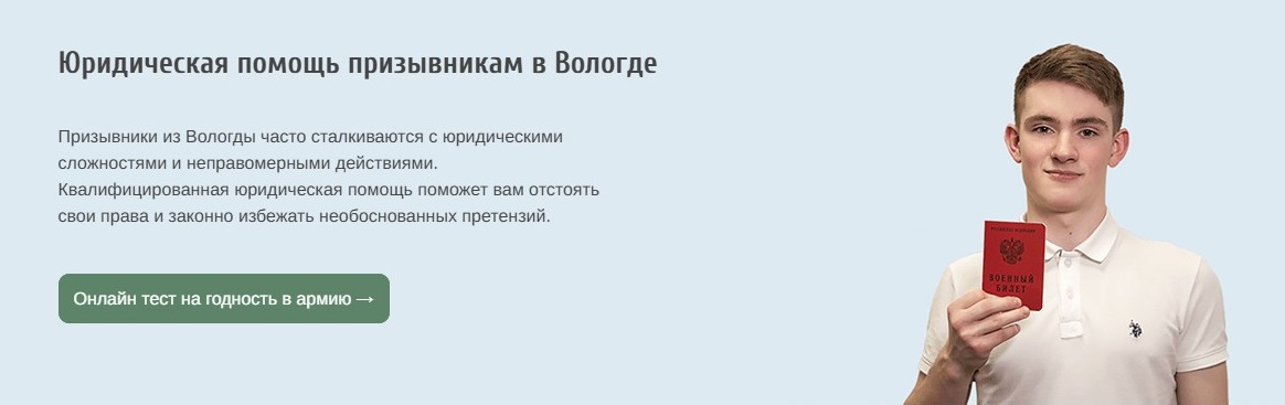 Стартуя в мире юридической помощи, призывники могут воспользоваться консультациями по вопросам, касающимся призыва. Квалифицированные юристы могут дать помощь призывникам из Вологды разъяснения по поводу статуса призывника, условий освобождения от службы, а также сроков и процедур, связанных с призывом. Это поможет разобраться в своих правах и обязанностях.