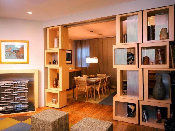— Стеллажи и открытые полки: использование стеллажей позволит вам не только разделить зоны, но и создать дополнительные места для хранения и демонстрации декоративных элементов.